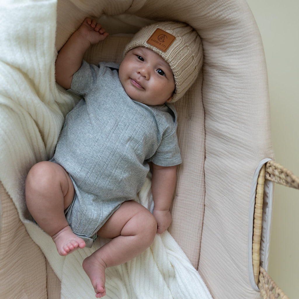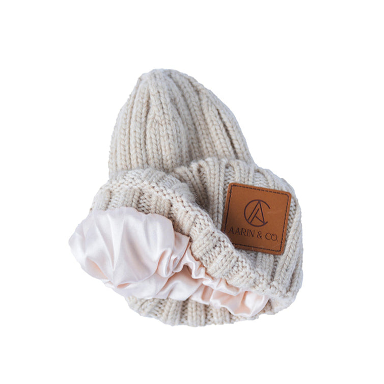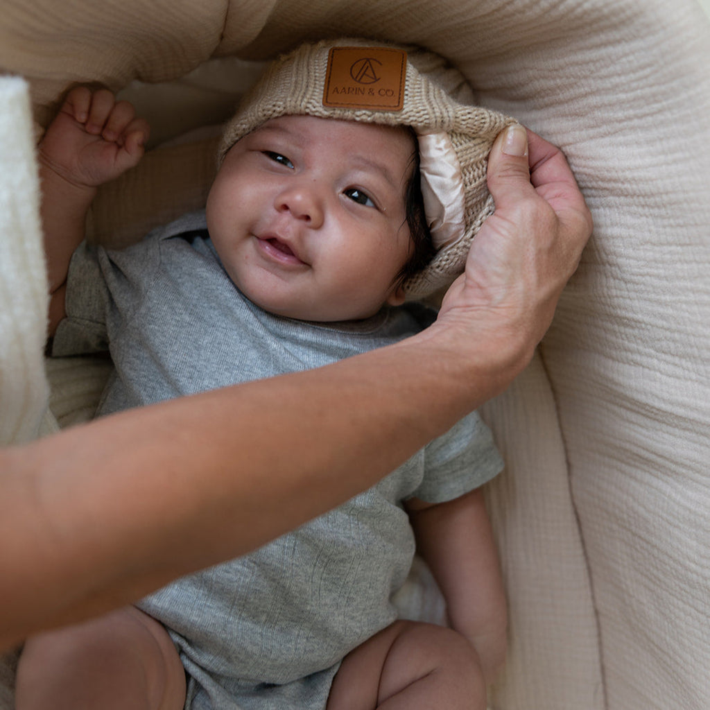 Our satin-lined ribbed knit beanies combine plush, cold-weather warmth with gentle hair protection. The luxe outer knit keeps your baby warm and stylish, while the silky satin lining prevents hair dryness and frizz that leads to breakage and damage during the colder seasons. Perfect for playtime, strolls, or chilly outings.