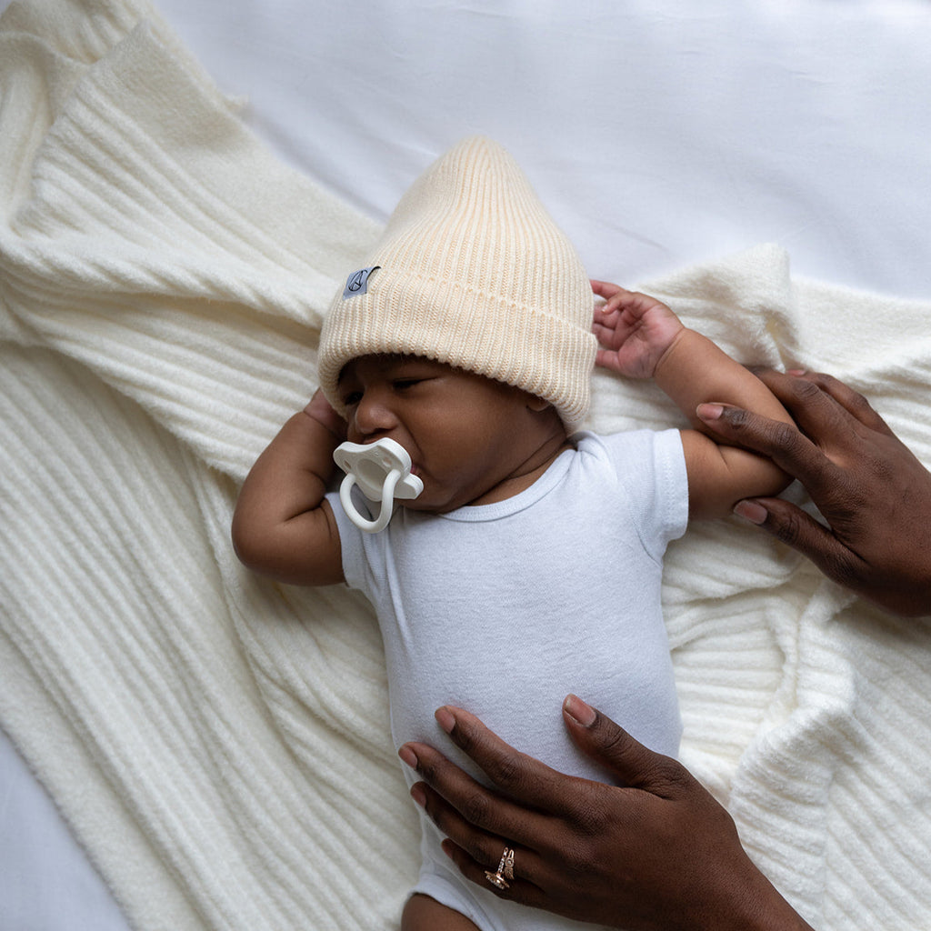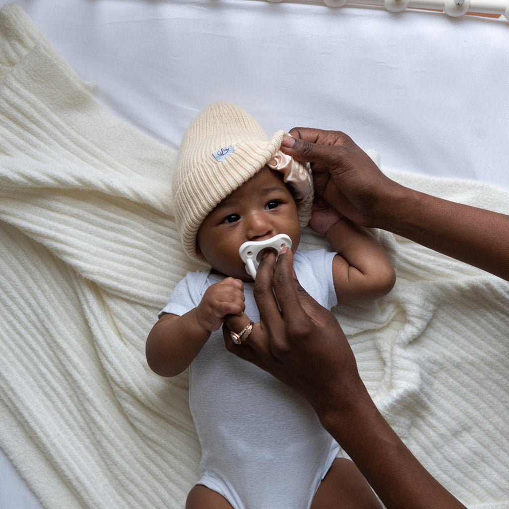 Our satin-lined ribbed knit beanies combine plush, cold-weather warmth with gentle hair protection. The luxe outer knit keeps your baby warm and stylish, while the silky satin lining prevents hair dryness and frizz that leads to breakage and damage during the colder seasons. Perfect for playtime, strolls, or chilly outings.